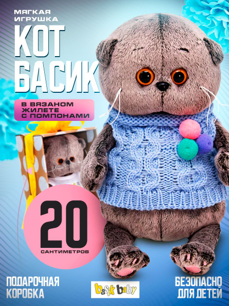 Мягкая игрушка Budi Basa Басик BABY в вязаном жилете с помпонами / Буди
